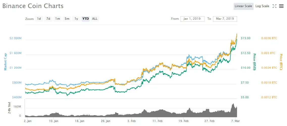 This week Binance Coin has pumped 50% from under $10 to over $15 which has pushed its market cap over $2 billion for the first time since the big crypto peak in January 2018. This epic performance has enabled BNB to flip both Tron and Stellar in the market cap charts. Yesterday it also conquered Tether and has taken seventh spot.