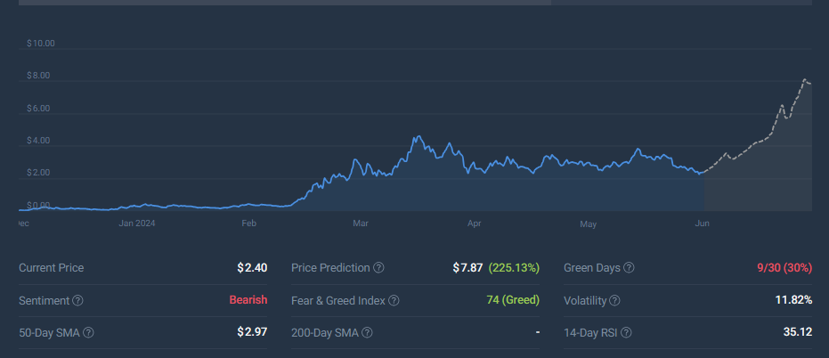 The present technical study for Dogwifhat, meantime, displays a negative attitude despite a positive price projection of a 225% rise to $7.87 by July 15, 2024. With a high level of greed at 74 the Fear & Greed Index points to possible overvaluation. Reflecting major price variations, Dogwifhat has had 30% green days with 11.82% price volatility during the past 30 days.