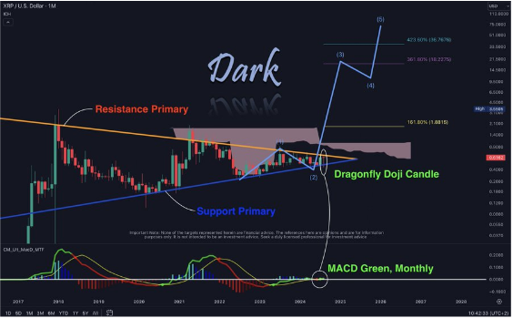 Dark Defender added that XRP staying above 1.03 “represents an extreme Bullish Zone above the Ichimoku Clouds on the monthly time frame.” The analyst also highlighted the Moving Average Convergence/Divergence (MACD) monthly indicator, which he noted had turned bullish for the coin.