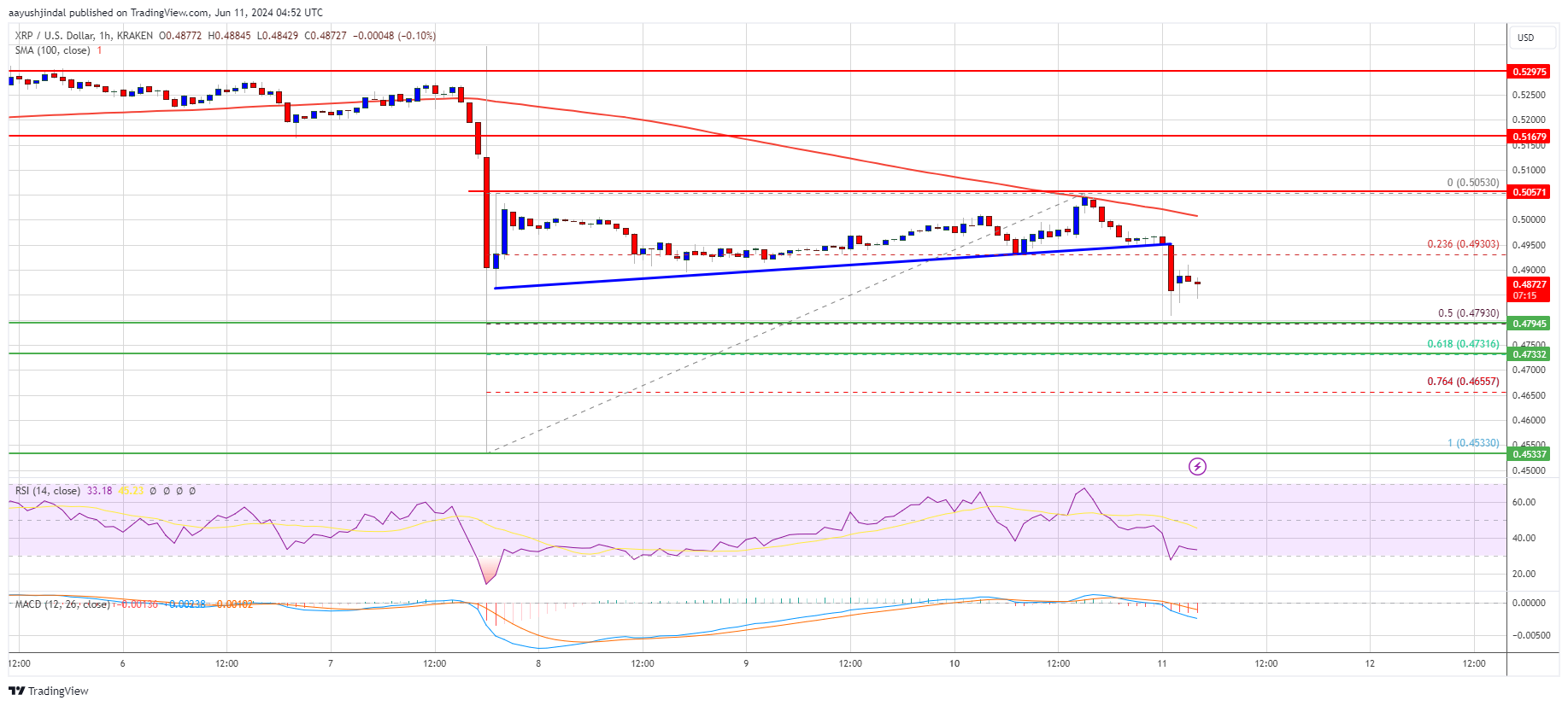 If XRP fails to clear the $0.4950 resistance zone, it could continue to move down. Initial support on the downside is near the $0.480 level.