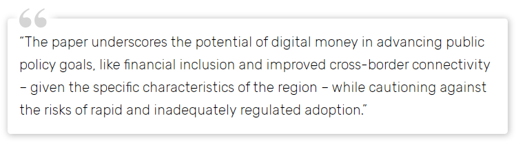 The report examines the potential benefits of digital money in advancing public policy goals, such as financial inclusion and improved cross-border connectivity.