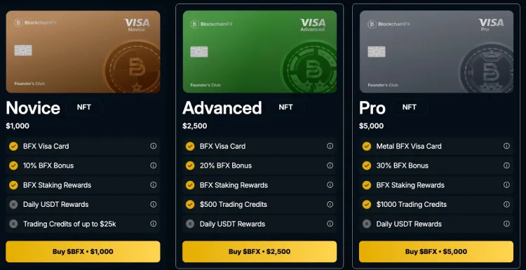 Founder’s Club membership tiers structure participation levels starting at $1,000 for Novice with 10% bonus tokens and BFX staking rewards.